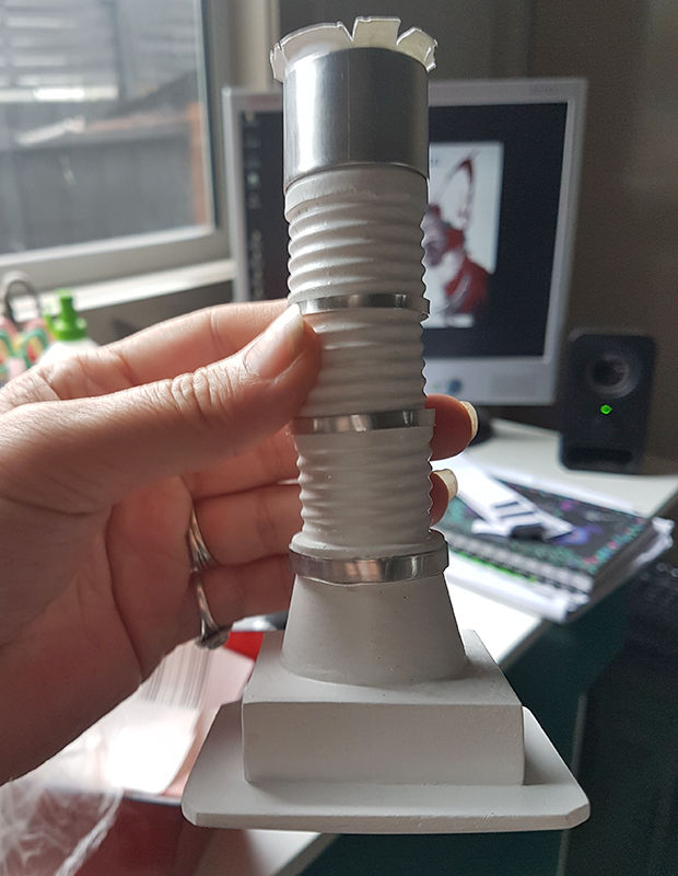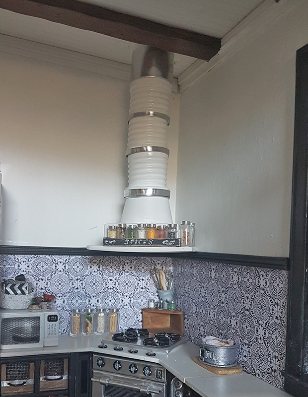 So a corner range hood was a bit challenging but I knew I wanted a circular style with a shelf for some spice jars. I had some old outdoor solar lights with an interesting shape so I stuck a bunch of them together and made a bottom cover from basswood. I couldn’t make seamless joins so I added some metal to cover them up. I had to make sure I could still thread my light down through the tube. I finished off the bottom with some painted plastic mesh for the filter.